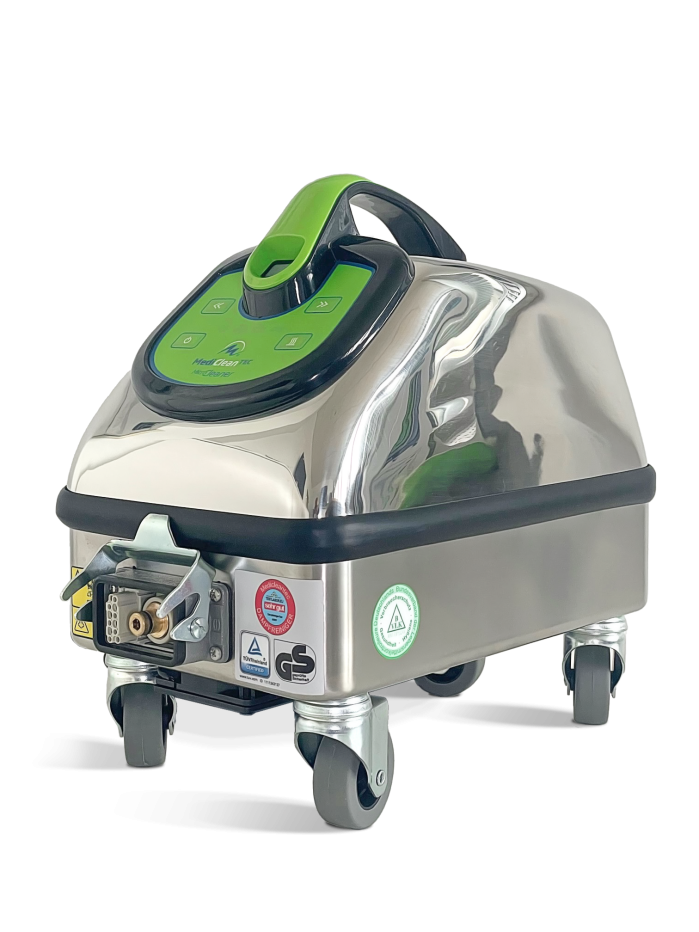Porentiefe hygienische Reinigung mit reinem Leitungswasser und starker Hitze. Durch die enorm hohe Temperatur im Inneren des Kessels entsteht großer Druck und damit feinster trockener Mikrodampf, der Schmutz und Keime aus den Poren aller Oberflächen entfernt und keine chemischen Rückstände hinterlässt.